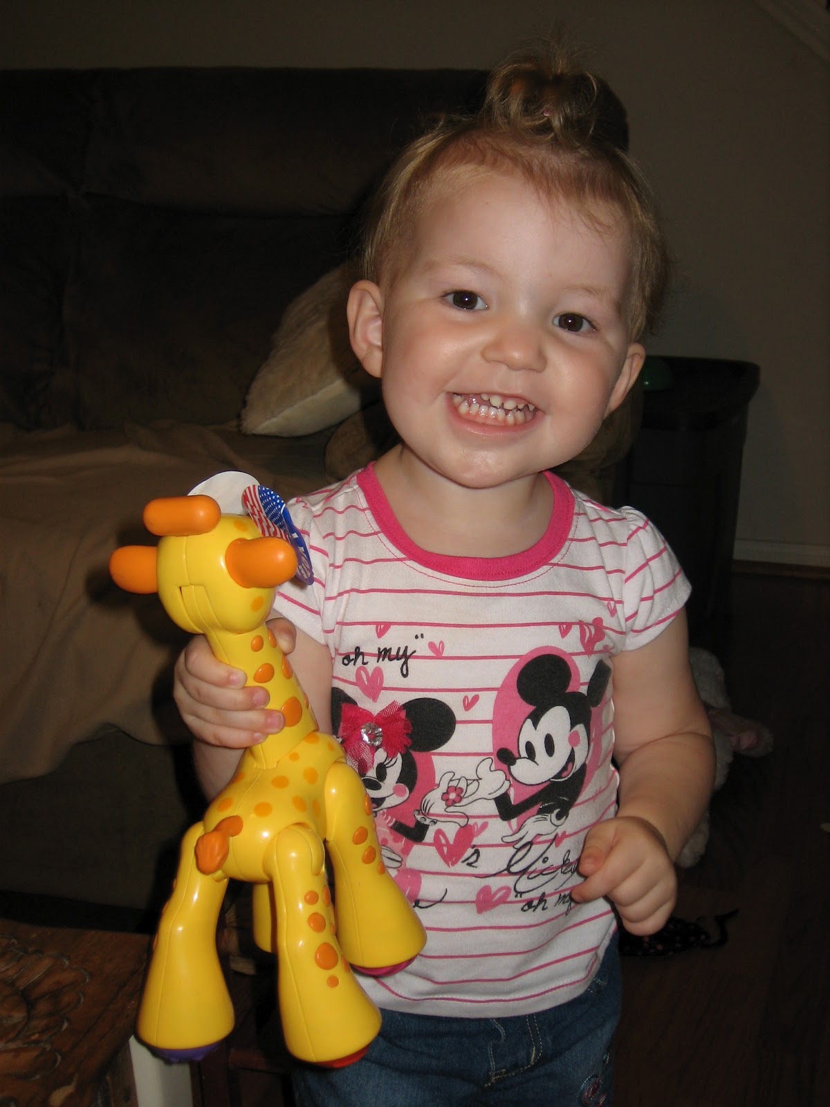 Kylie is still doing great in her big girl bed! One day at nap, I noticed on the monitor she wasn't in her bed, I went to check and she was standing at her gate clapping and cheering for herself. It was pretty funny, but I had to act like I was really mad and got onto her for getting out of bed when she should have been napping. I feel a little bit bad, but when she's doing something that could possibly hurt her, we tell her to be careful or it will hurt her toe and that is enough to usually make her stop. I told her if she fell getting out of bed she might hurt her toe so she needs to wait for Mommy or Daddy. Earlier in the summer, she dropped a can of food on her toe and it bruised her toenail (which is now loose and probably will fall off soon) that was such a traumatic experience for her, she is so scared of hurting her toe again.